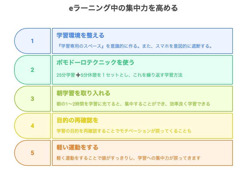 自分のペースで進められるeラーニングは魅力的ですが、「なかなか集中できない」「ついスマホを見てしまう」といった悩みを抱える人も少なくありません。ここでは、集中力を取り戻すための具体的な対処法をご紹介します。