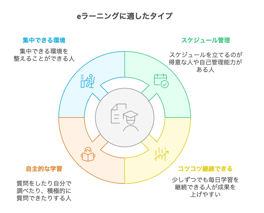 eラーニングは自由度が高い分、自分を律する力が問われる学習方法です。そのため、「自分で計画を立てて実行できる」「毎日コツコツ取り組める」「集中できる環境を自分で整えられる」などの特徴を持つ人にとっては、非常に適した方法と言えます。