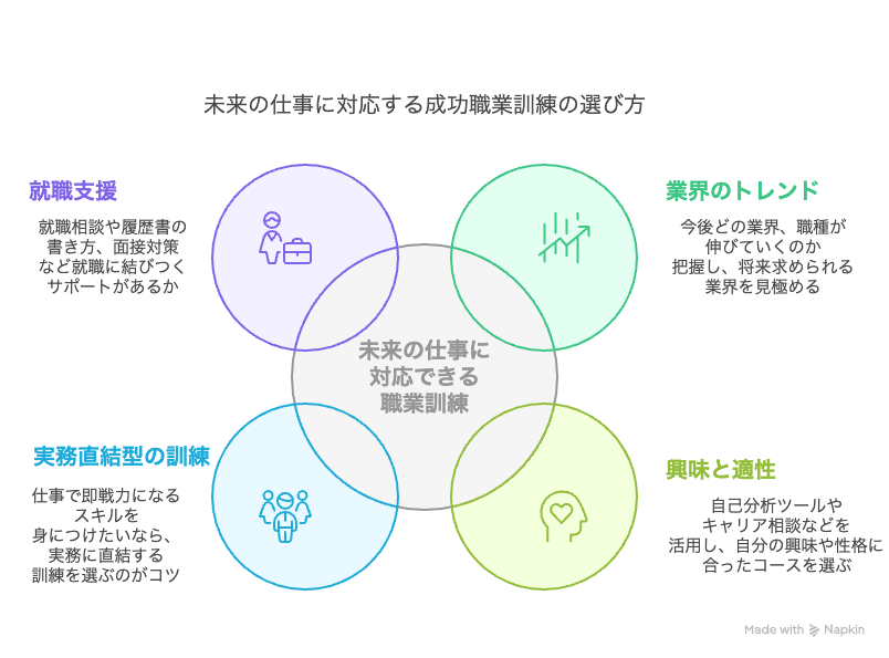 職業訓練は、未経験からでも未来の仕事に必要なスキルを効率よく身につけられる制度です。テクノロジーの進化に対応するためには、「今」の学びが「未来」の仕事につながります。次のセクションでは、未来志向で職業訓練を選ぶためのポイントを詳しくご紹介します。