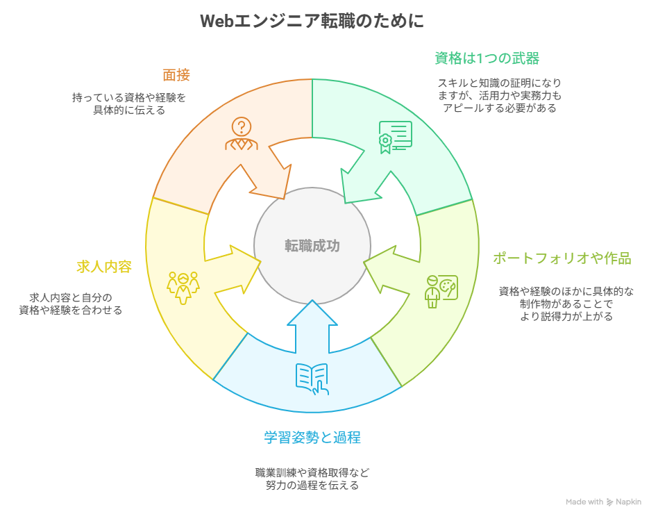 Webエンジニアとして転職する際、資格はあくまで「知識の証明」です。資格を取得しただけでは採用が保証されません。ここでは、資格取得後に転職活動で意識すべきポイントを整理します。